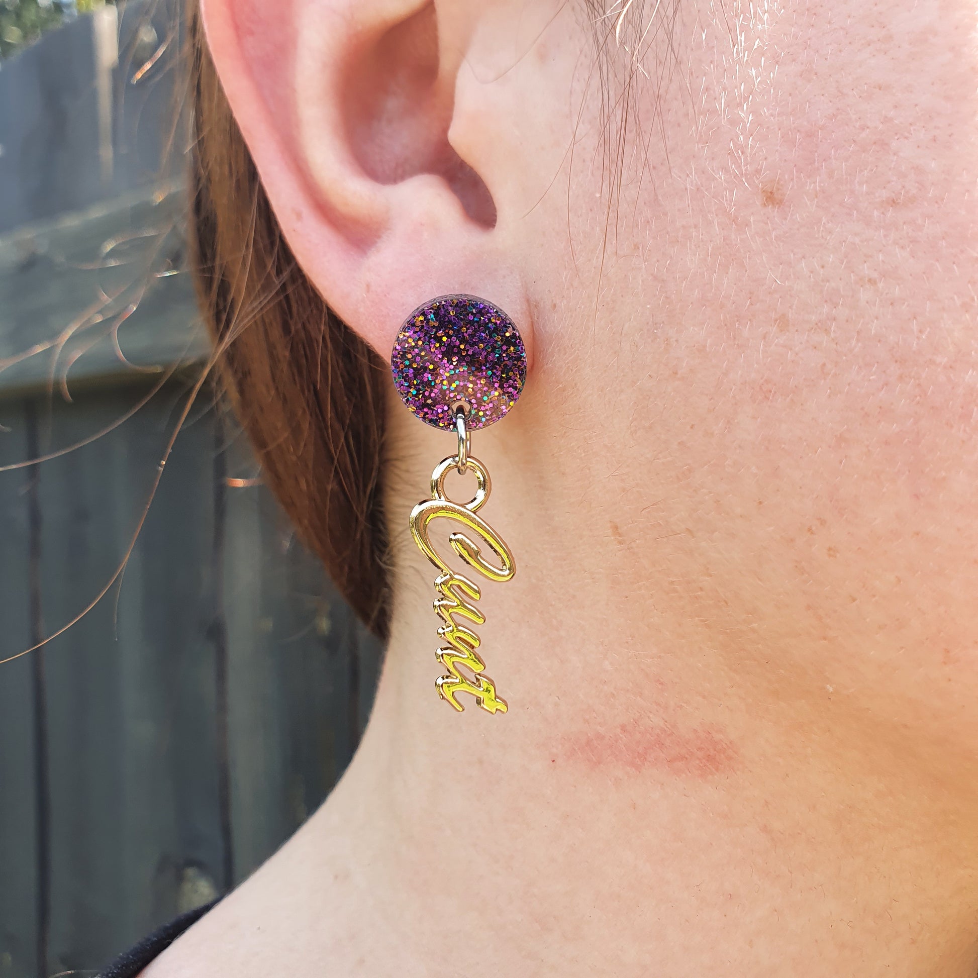 - Dimensions 15mm Glitter Purple Acrylic with Gold Detail drops approx. 40mm